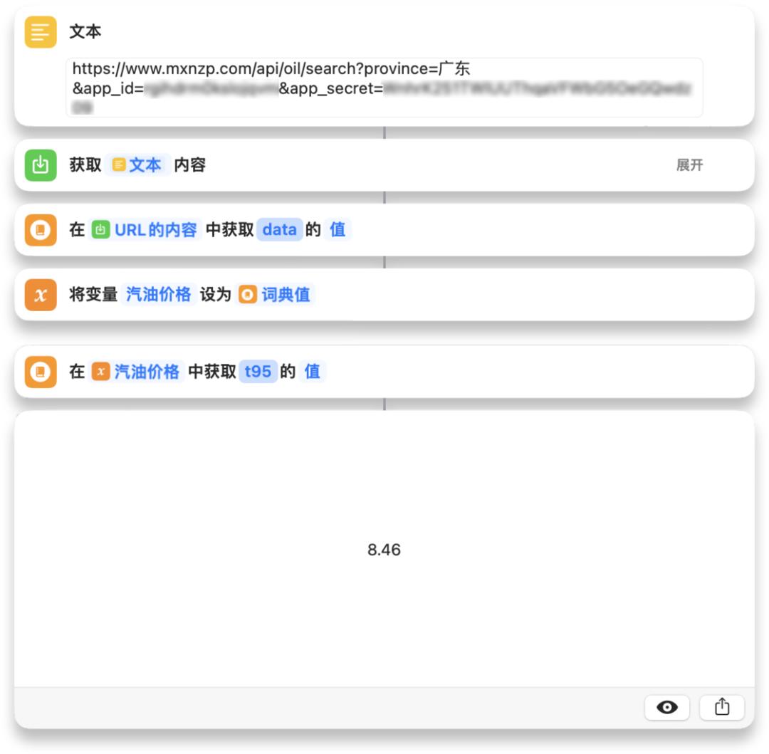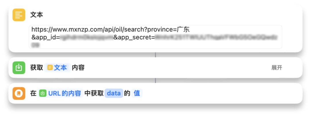 不同于前文的天气信息,快捷指令并没有为我们提供油价相关的查询功能。这时,Power User 经常提到的 API 就是一个极佳的解决方法。