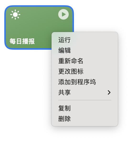 在 iOS / iPadOS 上直接点击即可运行对应的快捷指令,点击矩形右上角的 ··· 即可编辑。长按即可展开菜单,快速进行重命名、分享等操作。在 macOS 上,点击矩形右上角的 ▶︎ 即可运行,双击矩形则是打开编辑窗口,右键点击展开菜单。