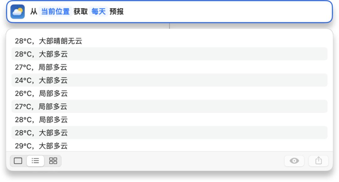 虽然前文只用了 2 个动作就完成了天气信息的获取,但我觉得「28°C 大部晴朗无云」这样的表述太笼统,没有任何参考价值,我想要的是「6 ~ 21°C,晴朗无云,降水概率 0%」这样详细的数据。
