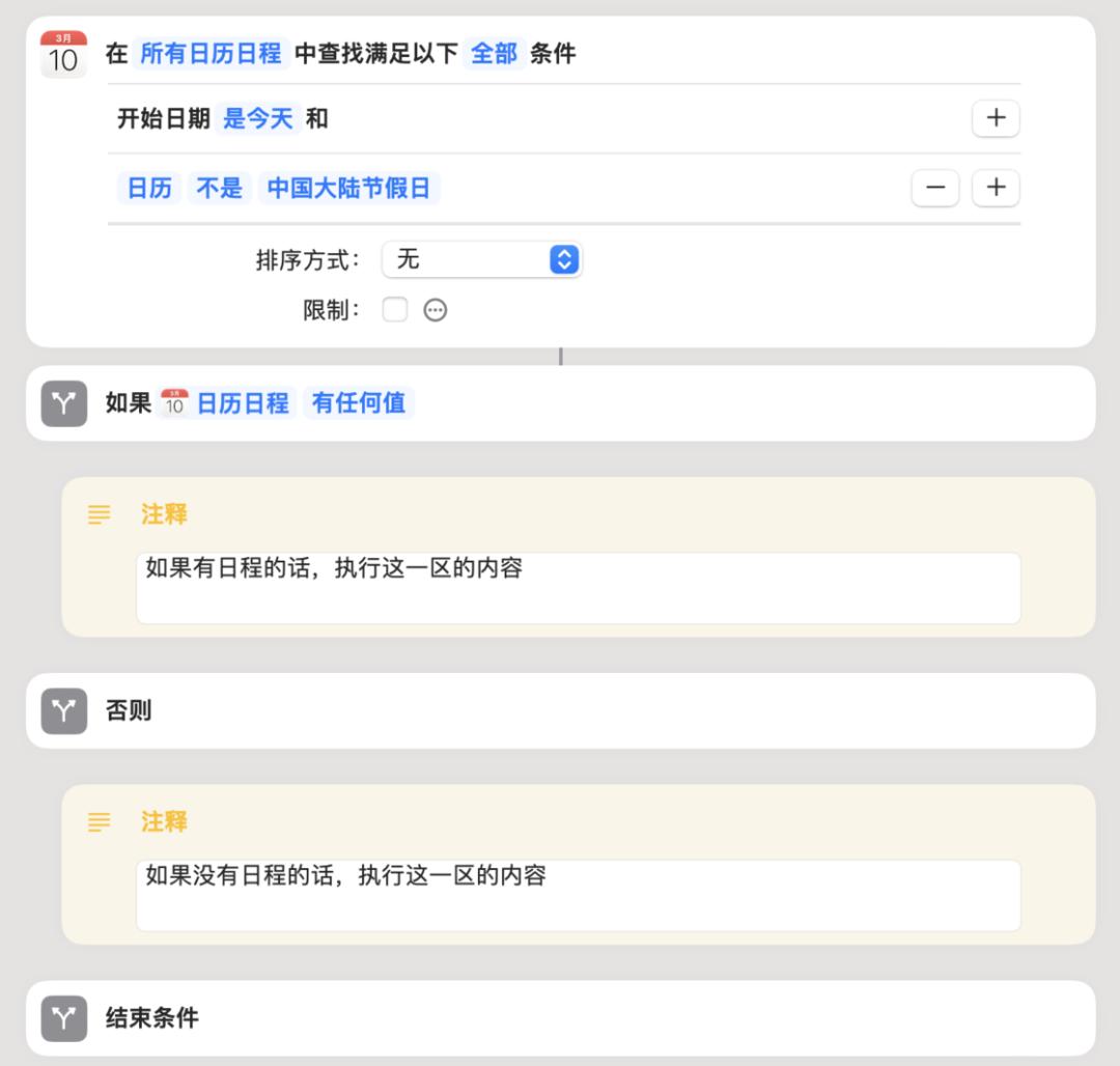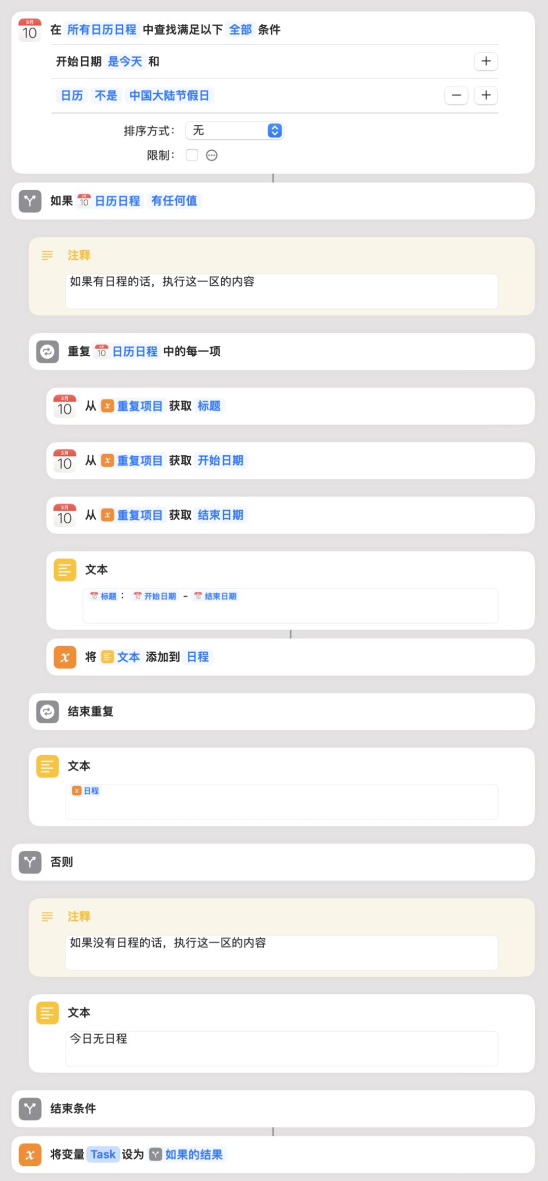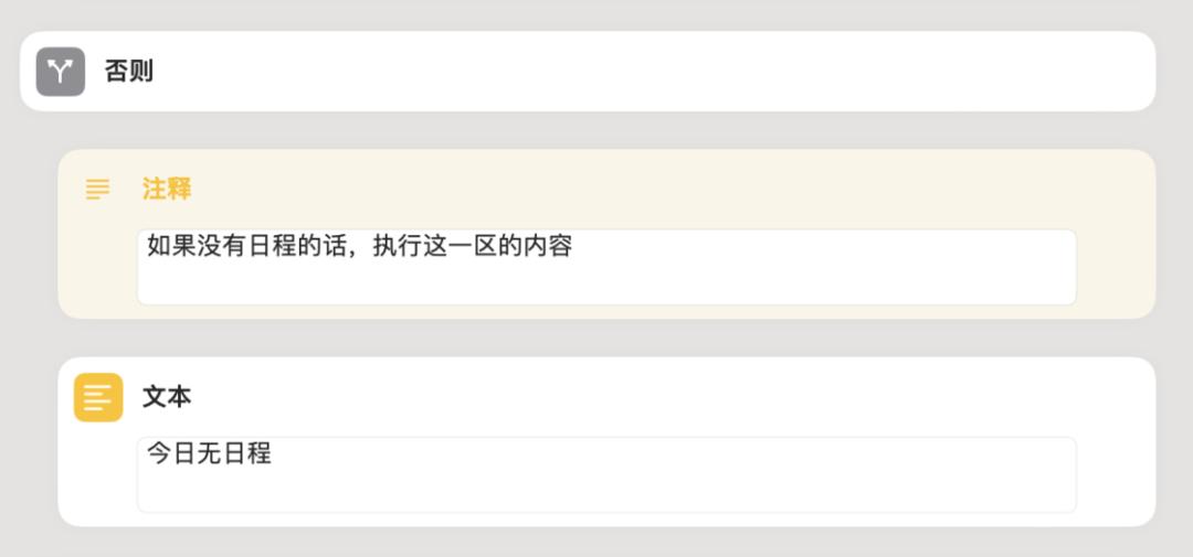 到这里,「今天有日程」的情况就已经完成了。至于无日程的情况就非常简单了,只需要添加一个「文本」并写入「今日无日程」即可。如果你嫌麻烦,甚至可以直接留空,在没有日程的时候,快捷指令会自动跳过日程相关的动作。