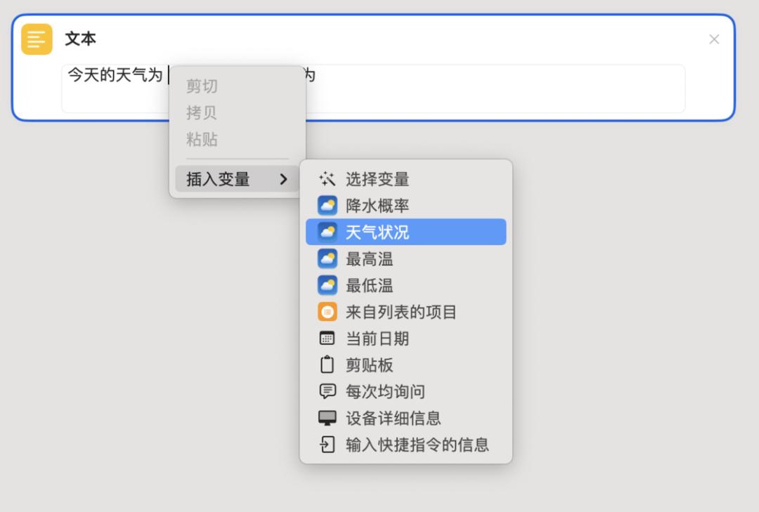 随后,在需要填入天气信息的地方点击右键,并在「插入变量」中选择对应的变量,iOS / iPadOS 则可以在键盘上方的工具条中选择变量。试着运行一下,就会发现之前的数据就已经被整合好了。
