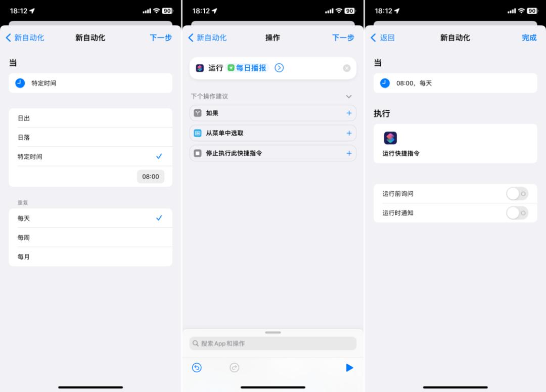 在完成快捷指令的编写之后,我们就可以把它部署到自动化流程之中,让快捷指令每天为我们自动播报,省去手动点击的麻烦。