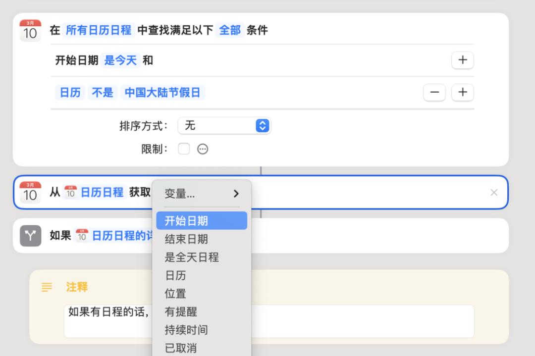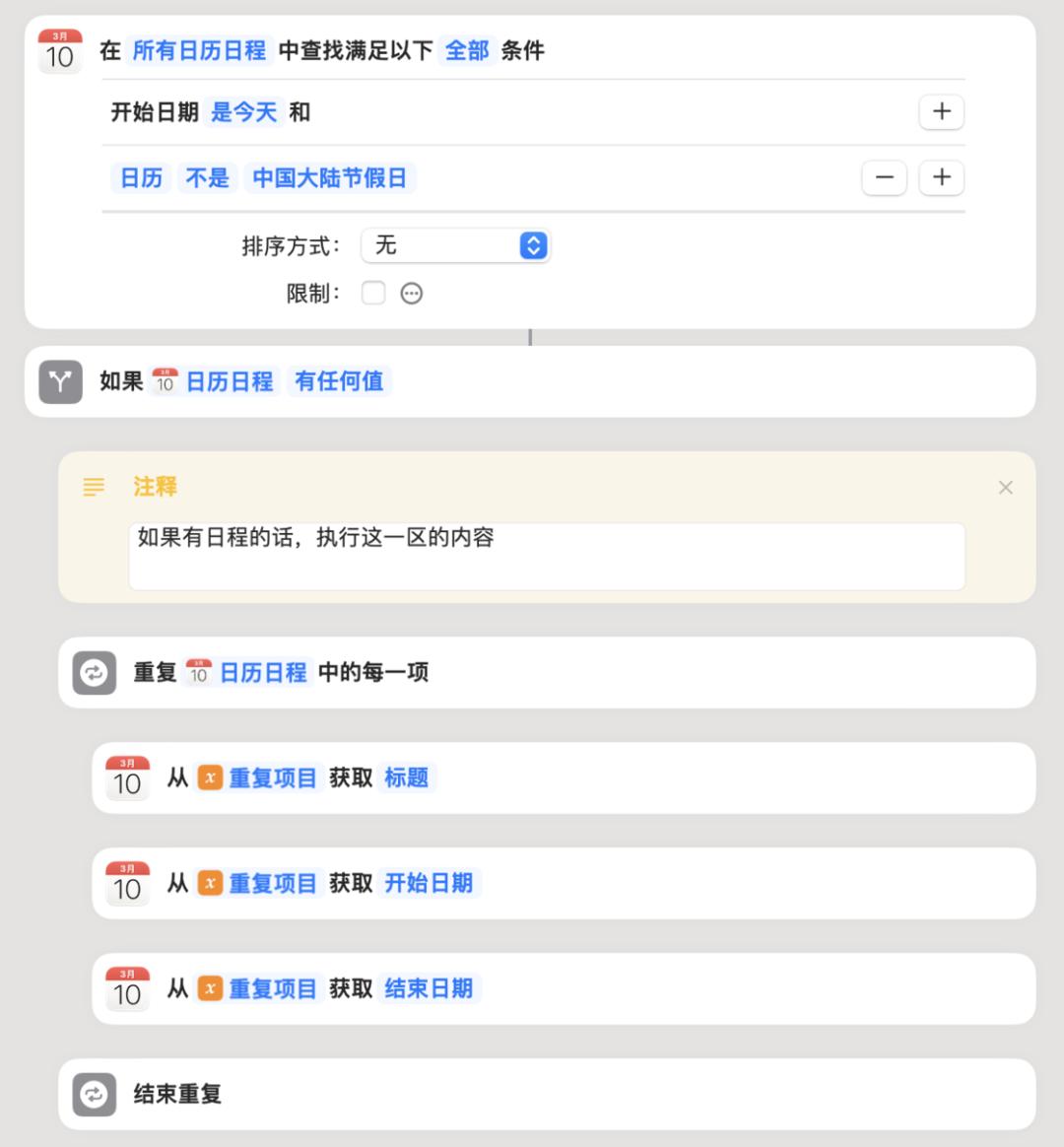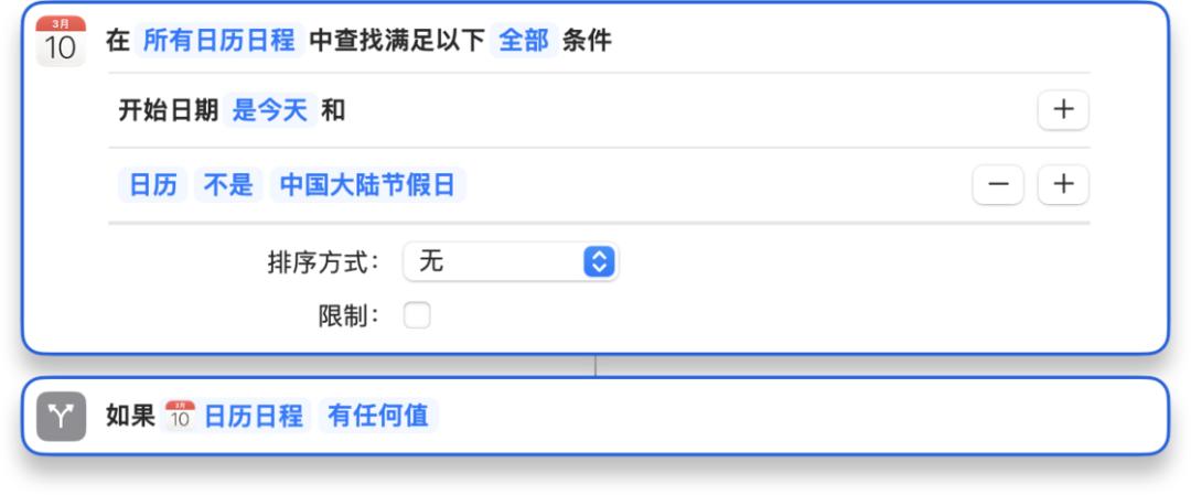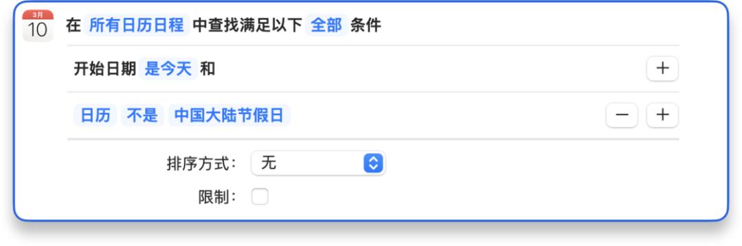 先说「查找日历日程」,如果想要筛选出今天的日程,那么只需要将「开始日期」的参数设定为「是今天」。此外,为了排除假日、节气信息的干扰,我们还可以点击动作右侧的 +号,设置一个「日历 不是 中国大陆节假日」的筛选条件。这样,快捷指令就会帮你筛选出今天需要执行的所有日程展示出来。