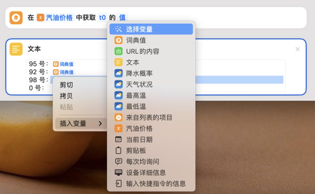这时候,我们可以点击右键,选择「插入变量 > 选择变量」,随后选择对应动作下方的「词典指」即可。iOS / iPadOS 则可以在键盘上方的工具条点击「选择变量」。