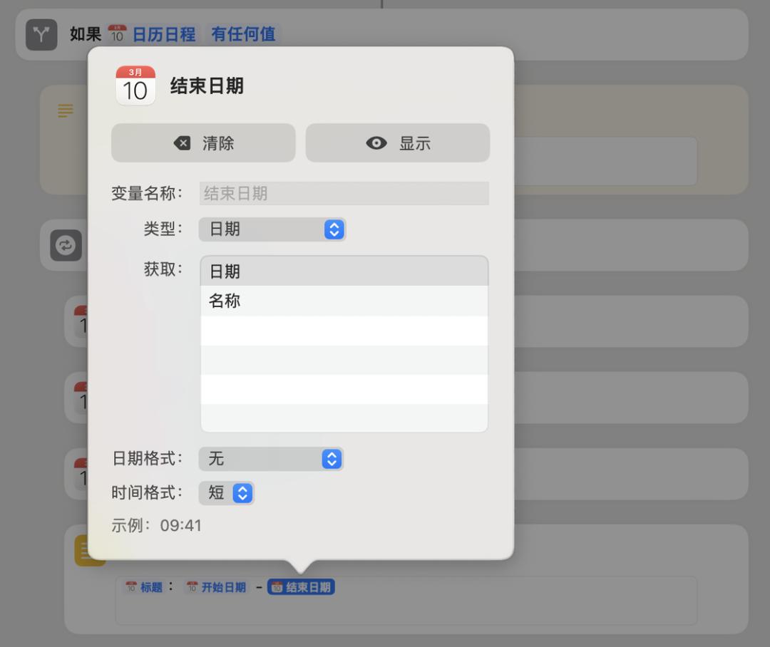 随后,下方添加一个「文本」动作,并通过右键(macOS)或键盘上方的工具栏(iOS / iPadOS)填入「📅标题:📅开始日期 - 📅结束日期」。在填入开始日期和结束日期的时候,快捷指令通常会弹出格式菜单,我建议把日期格式设置为「无」,时间格式设置为「短」。