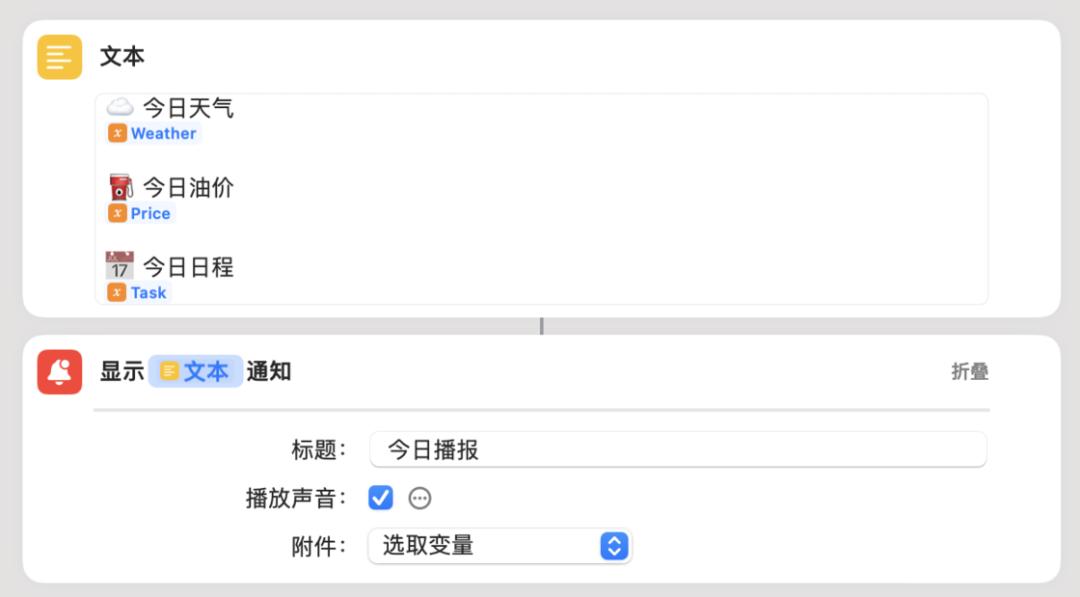 读到这里,相信你的思路也非常明确了。我们要做的这个「每日播报」的快捷指令分为 3 个模块,并在最后将各模块的信息集中为一条推送通知。