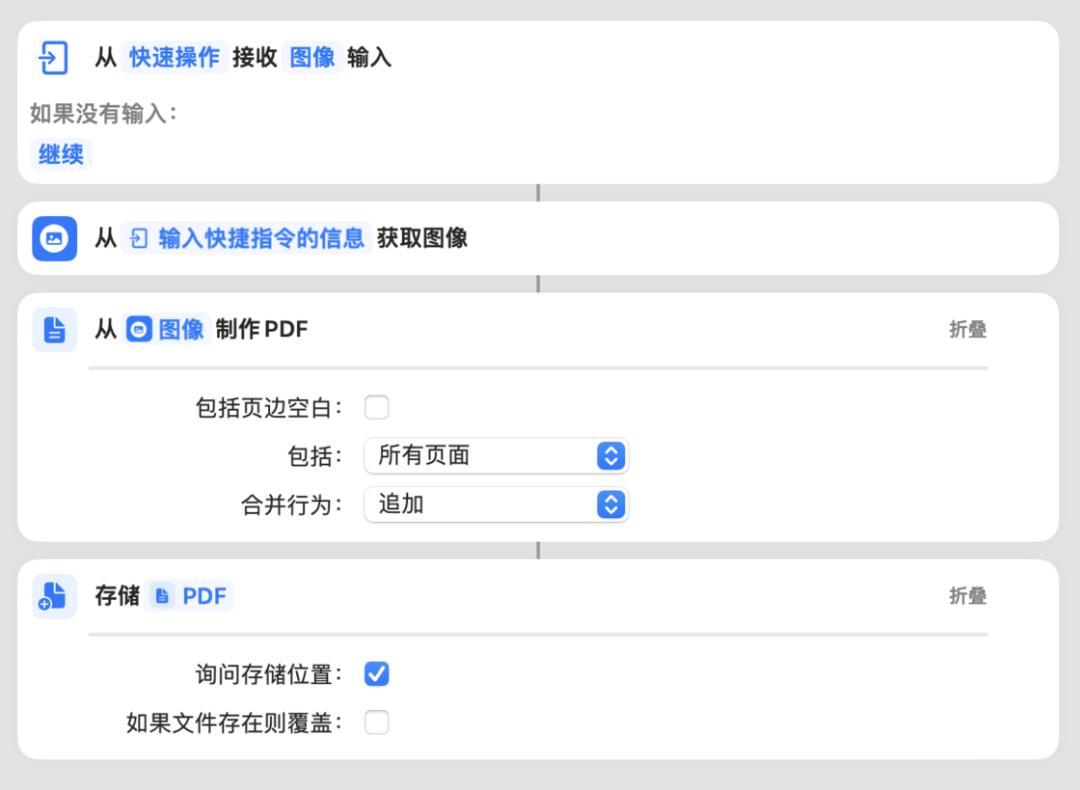 这个快捷指令的逻辑非常简单:「导入照片 > 制作 PDF > 保存 PDF」。相信所有人都能想到这个逻辑,但或许出于对快捷指令的不熟悉,或是未形成用快捷指令解决问题的思维,往往容易绕了远路。