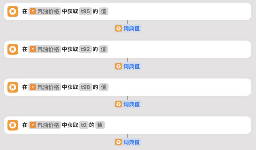 我建议你用「设定变量」功能将数据存储起来,在后续调用的时候会更加直观、方便。之后,只需要在「获取词典内容」里,将「词典」值设定为变量,再将「键」设定为 t89 / t98 / t92 等汽油型号即可。
