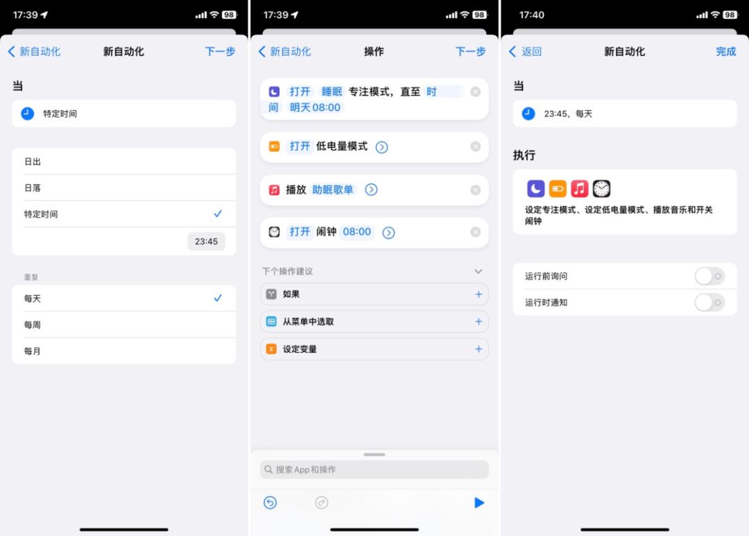 你每天 23:45 上床睡觉,会打开睡眠模式,并播放一段助眠音乐,为了节省手机电量,你还会打开低电量模式。同时,为了避免没开闹钟睡过头,还会再检查一遍 8:00 的闹钟是否打开。