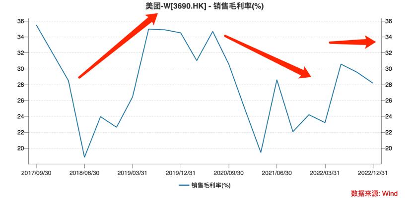 上图所描绘的美团毛利率轨迹,大致上证实了我们前文的猜想,2019年随着外卖业务的成熟和稳定,营销类收入迅速成长,毛利率得到很大改善,其后2020年后,毛利率下行主要是基于创新业务的孵化,如美团买菜,社区团购等新业务都在初期拉低企业整体毛利率,这些也都是意料之中的。