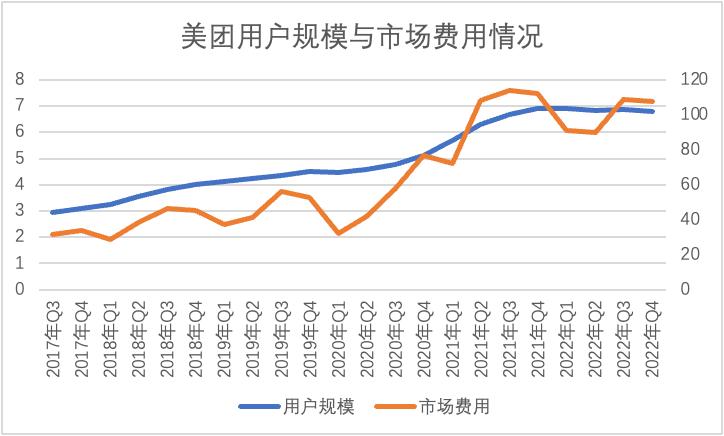 在上图中也可以看到2021年之前,在用户规模快速成长之时,市场费用乃是波澜不惊,这再一次证实了美团发展之初,外卖扮演了获客先行军的角色,很大程度上抑制了市场费用的扩张。