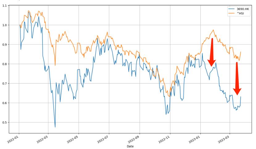 我们首先整理了2022年至今恒生指数与美团股价的走势情况(将2022年初视为基点“1”),见下图