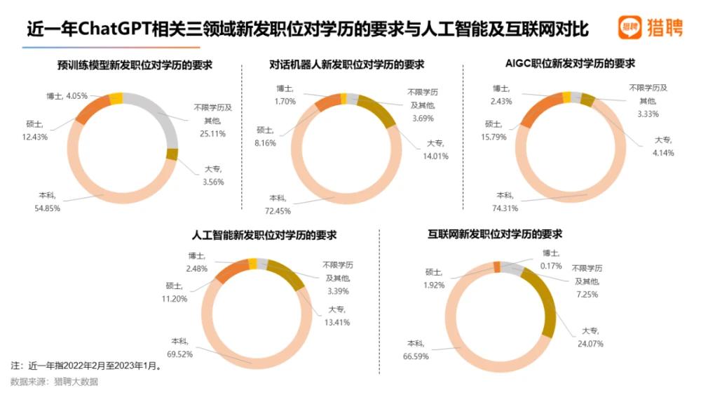 据《ChatGPT 相关领域就业洞察报告》显示,ChatGPT 涉及的领域均属技术前沿,职位对于学历的要求较高。近一年,明确要求本科以上学历的在预训练模型、对话机器人和 AIGC 中分别占到 71.33 %、82.30 %、92.53 %;三者对硕博士学历的需求总和分别为 16.49 %、9.86 %、18.22 %;其中预训练模型对硕博学历的需求更为迫切。