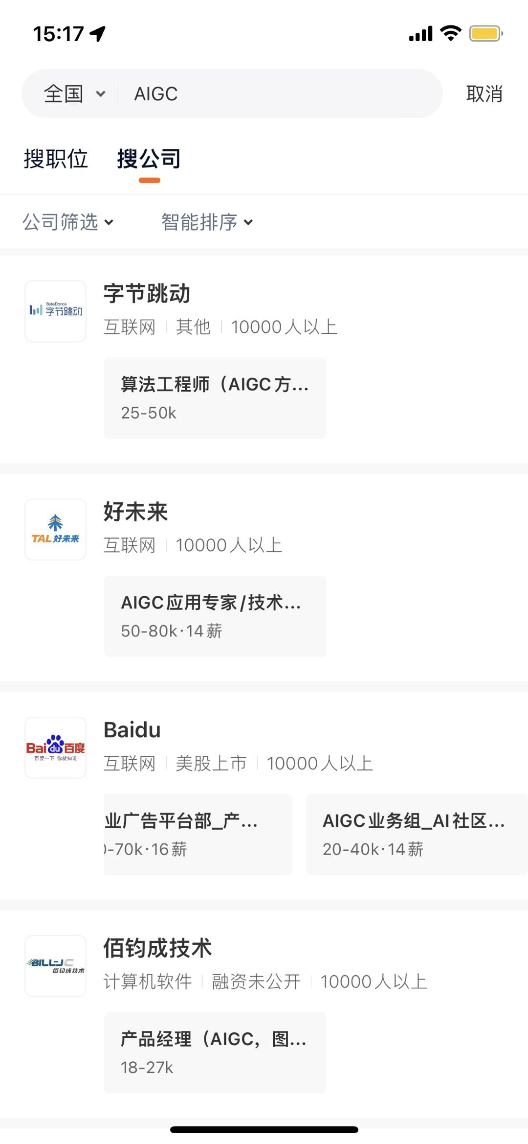 除此之外,各大招聘网站上的“猎头”们正在掀起一股 AI 人才的“招聘潮”。从猎聘网对“AIGC”等关键词进行搜索,便可发现直接字节跳动、百度、好未来等公司对“算法工程师”、“ AIGC 应用专家”等职位存在明显需求,月薪最高可达 8 万。