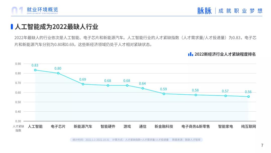 2023 年 1 月,脉脉人才智库发布的《抢滩数字时代·人才迁徙报告 2023 》中就提及了:人工智能成为 2022 年最缺人的行业 ,人才紧缺指数(人才需求量/人才投递量)达 0.83 。