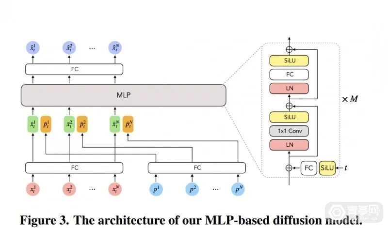 因此,Meta科研人员提出了一种全新的条件扩散模型:AGRoL(全称为“Avatar长腿”),该模型由简单的多层感知器架构(MLP)、运动数据调节方案组成,专门以稀疏信号为条件,根据上半身定位来生成全身姿态。据了解,这种只利用稀疏定位信息重建全身姿态的扩散模型,为市面上首例。