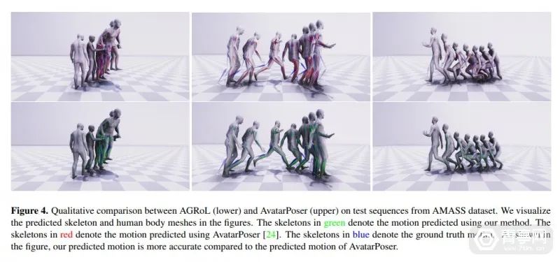 此外AGRoL提升了MLP网络性能,并超越了此前的方案,明显降低了抖动误差,因此和AvatarPoser等其他模型相比,ARGoL生成的动作更加平滑。此外,在追踪信号丢失的情况下,ARGoL的准确度下降不多,因此在追踪信号稀疏的情况下也能较准确的模拟运动。