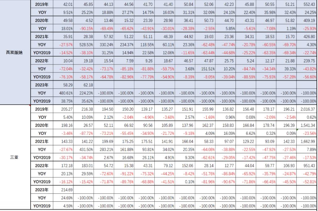 景鉴智库提供了一份2023年机场旅客吞吐量对比数据,西双版纳机场到访人数1月同比增加481%、2月同比增加224%,和2019年同期相比增加38.75%。