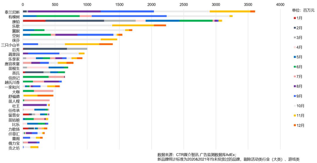 2022年广告市场整体新增TOP30品牌分月花费表现