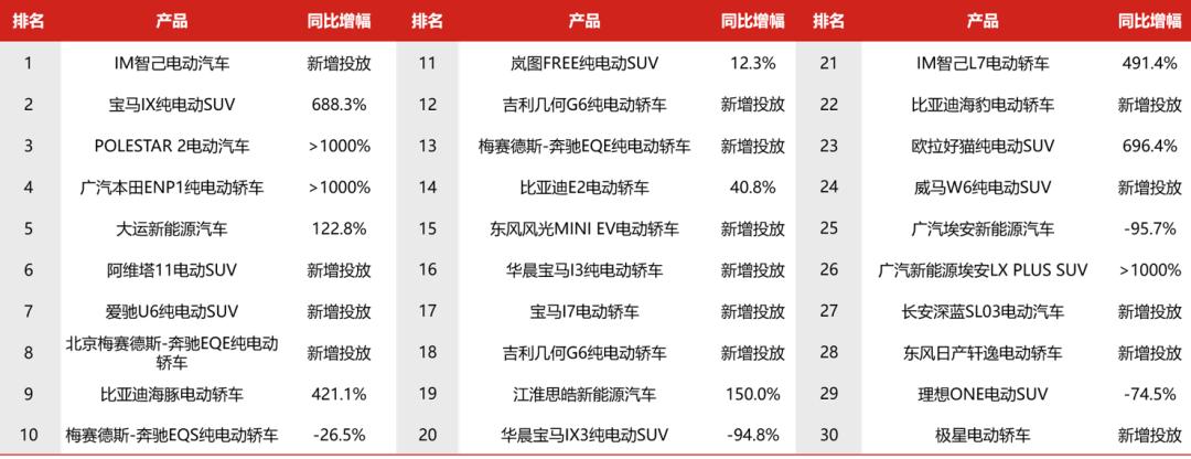 ●此外,报纸和网站也有少量投放。同样投放量较大的新产品还有宝马IX纯电动SUV、POLESTAR 2电动汽车、广汽本田ENP1纯电动轿车等。