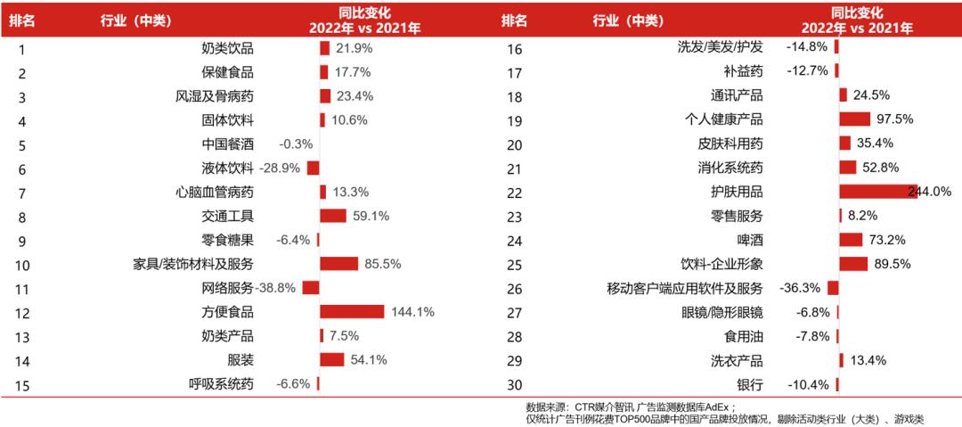 2022年国产品牌广告花费行业(中类)TOP30榜单