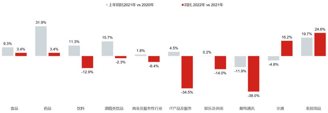 2022年广告市场整体TOP10行业(大类)广告花费变化,