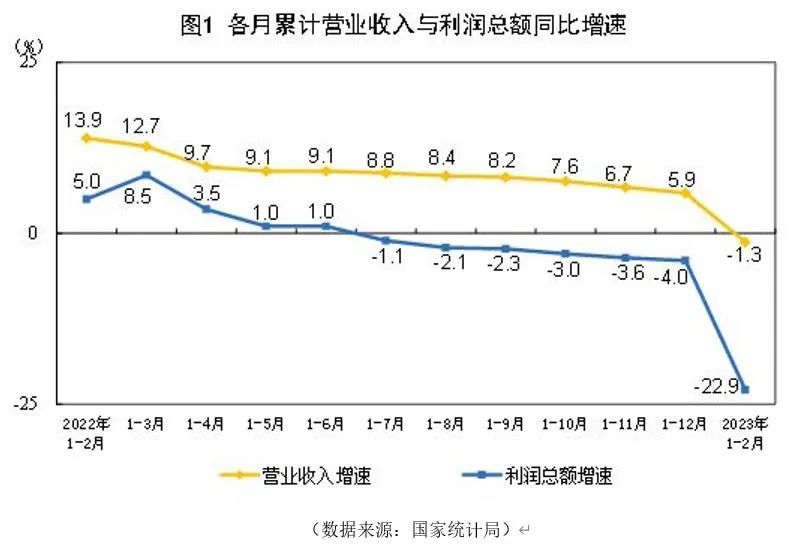 国家统计局工业司统计师孙晓解读,这一利润总额同比降幅受量价等多因素影响。一是从收入看,尽管工业生产有所回升,但市场需求尚未完全恢复,企业营业收入同比下降1.3%,降幅较上年12月份扩大1.0个百分点;二是从成本看,营收降幅大于成本降幅,导致企业毛利下降,下拉工业利润18.6个百分点;三是从价格看,PPI受同期基数较高影响,1—2月份同比下降1.1%,降幅较上年12月份有所扩大,对企业盈利形成较大压力。受上述因素影响,原材料和装备制造业利润降幅较大,分别下拉工业利润15.7、6.5个百分点。