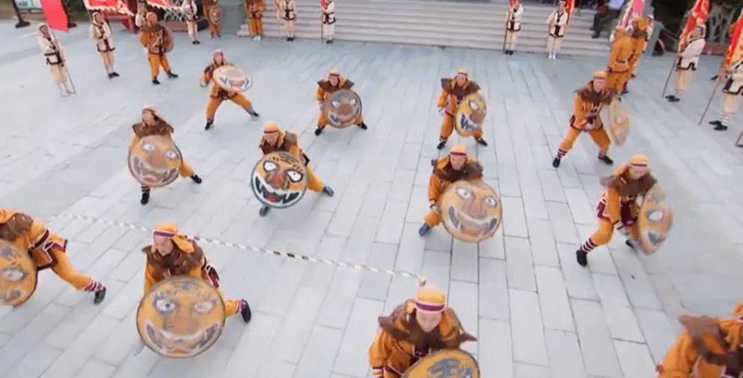 当看到有一群人身穿亮黄色衣服,手拿虎头藤牌和各类兵器,似舞又似操地做出各种动作时,不用质疑,这就是藤牌操表演了。