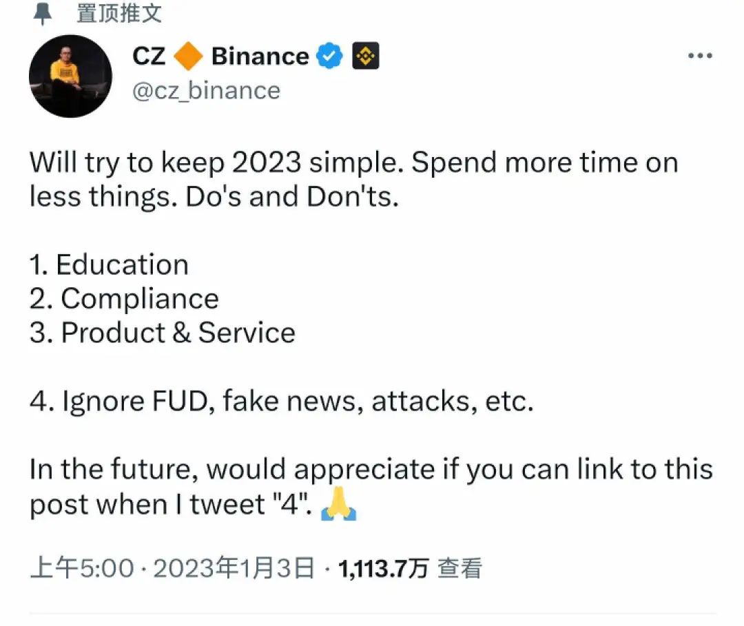 而此前赵长鹏发布一条推特表示,如果以后提及“4”这个数字,就代表Ignore FUD,fake news,attacks,etc,即忽略FUD(恐惧、不确定性、怀疑疑)、假新闻、攻击等。