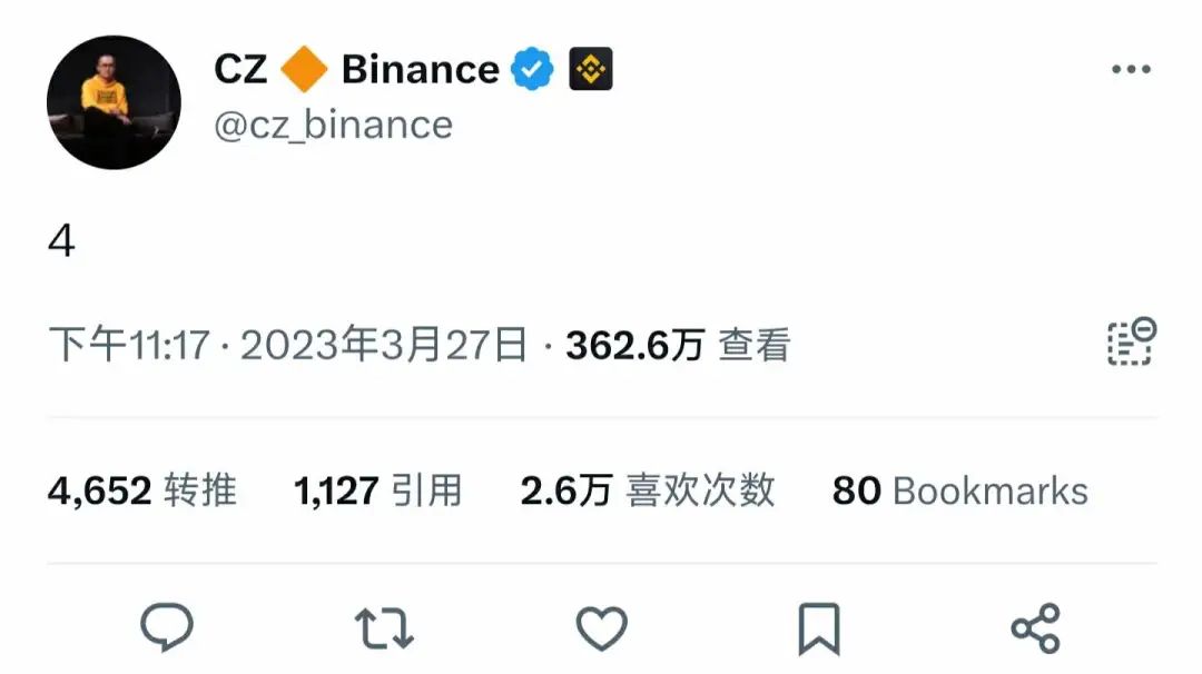 对于 CFTC的指控,赵长鹏给予了否认,并在CFTC官网更新前,赵长鹏发了一条内容仅有一个数字“4”的推特。