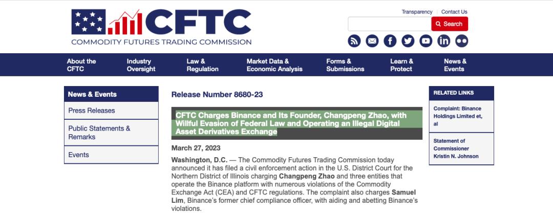 3月27日,美国商品期货交易委员会(CFTC)宣布,向伊利诺伊州北区地区法院提起民事诉讼,指控币安(Binance)及其创始人赵长鹏,称其涉嫌违反监管措施,CFTC还指控币安的前首席合规官Samuel Lim,协助和教唆币安违反法规。
