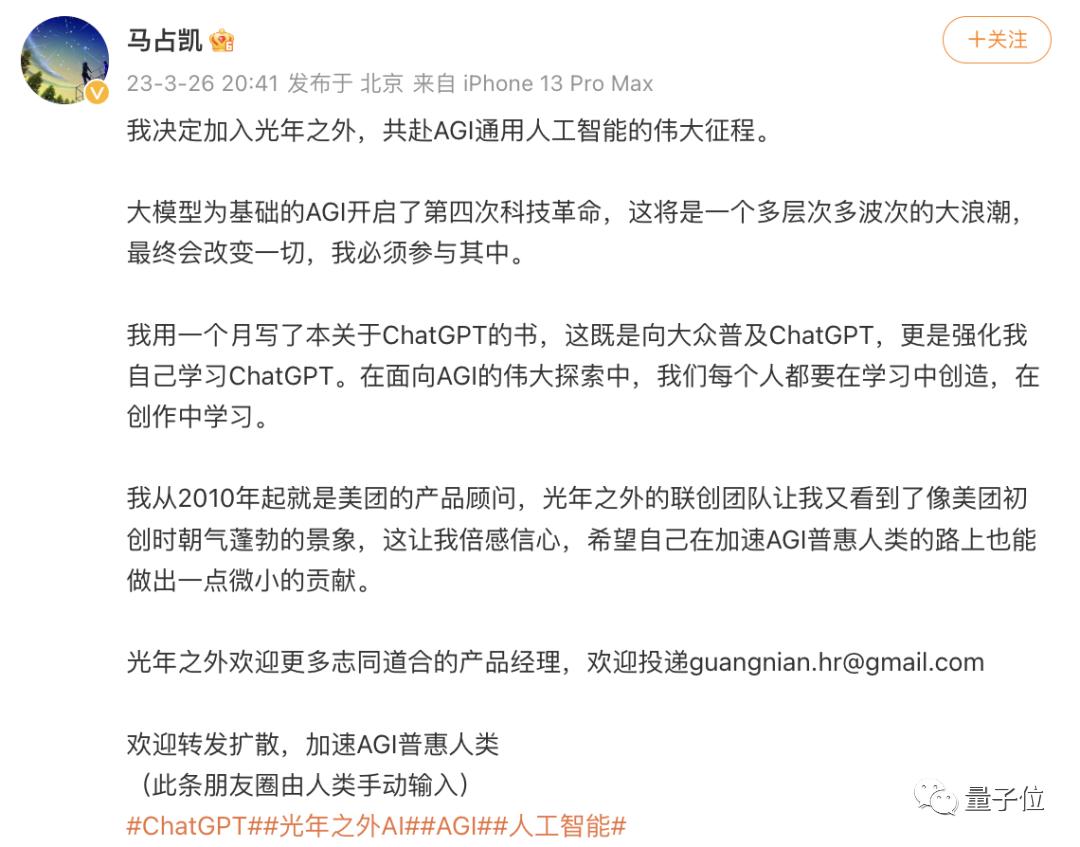 而就在前一天,搜狗输入法之父马占凯也表示加盟:共赴AGI通用人工智能的伟大征程。