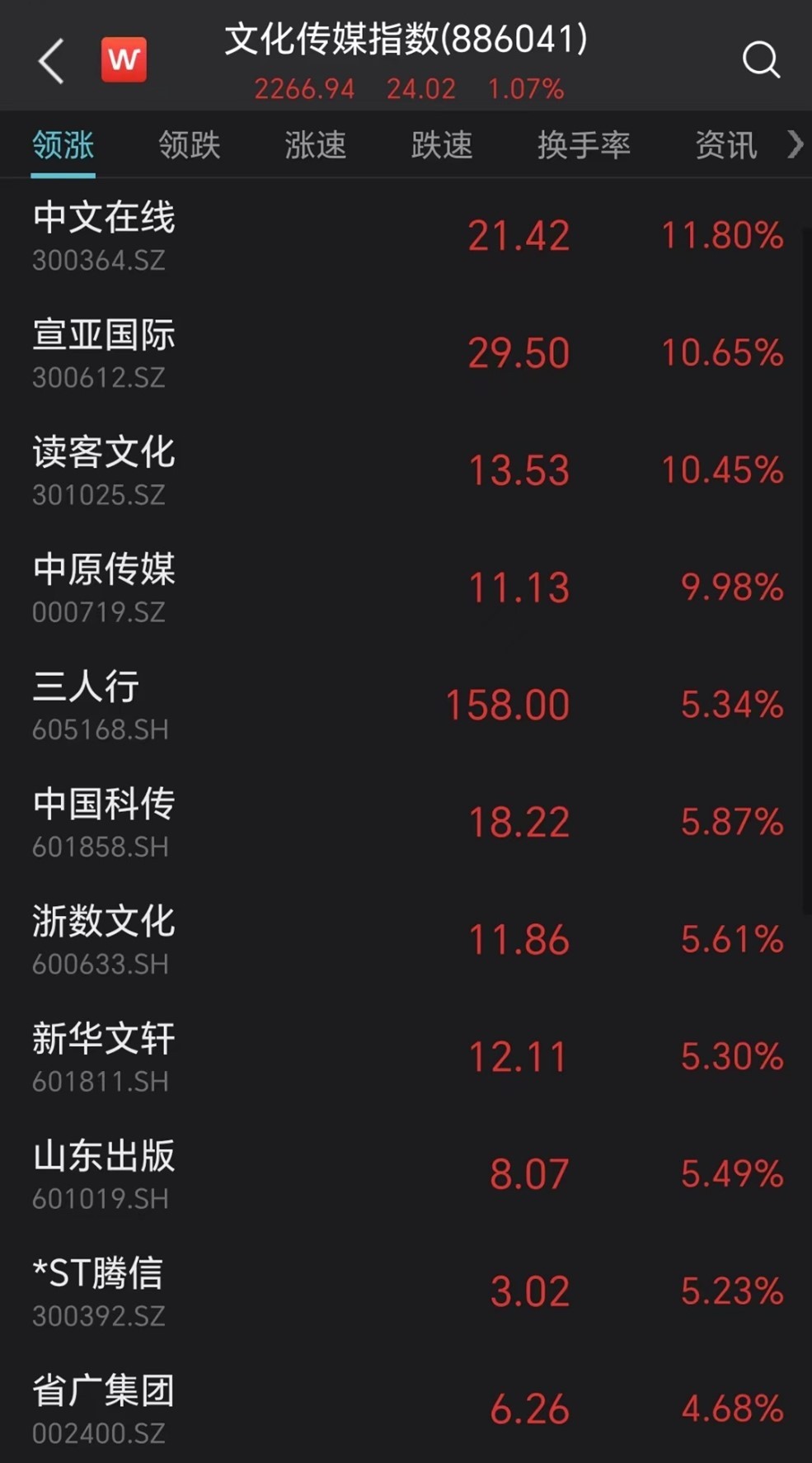 传媒板块震荡走强,中原传媒拉升封板,读客文化涨超11%,省广集团、凤凰传媒涨超5%,山东出版、新华文轩、长江传媒跟涨。