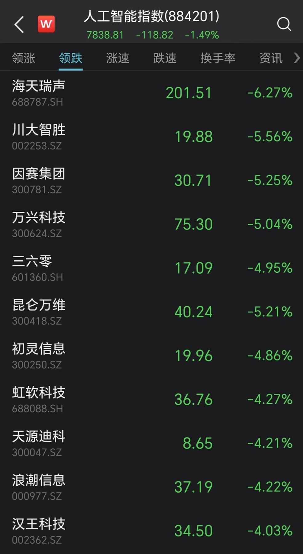 ChatGPT概念尾盘跌幅扩大,川大智胜封跌停,鸿博股份逼近跌停,昆仑万维跌超10%,景嘉微、汤姆猫、三六零、工业富联、万兴科技均跌超7%。