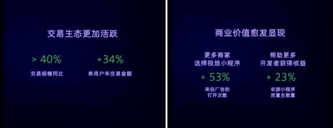 如过去一年,小程序整体交易规模同比增长了40%,单个用户年交易金额增长了34%,目前小程序整体GMV是几万亿的规模。