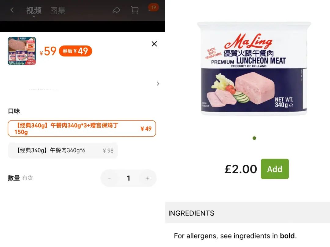 中英同规格梅林午餐肉的价格对比