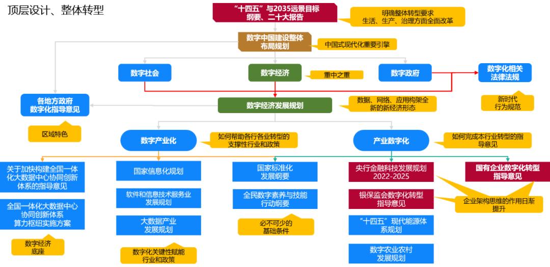 本轮国内的数字化转型有一个最强的力量推手,这就是国家政策,笔者之前曾经总结过国家数字化转型政策结构图,这些政策汇编起来也就是一本书,是中国式数字化转型的必读书,是数字中国的必读书,该结构图如下: