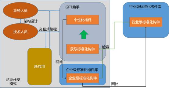 通过 GPT 去检索构件库,获取企业内部的企业级标准化构件和企业外部的行业级标准化构件,再进行修改产生个性化构件,而用途理想的个性化构件可以再返回到企业级标准化构建库,并通过行业级共享机制回补到行业级标准化构件库中,技术人员甚至可能是业务人员通过与 GPT 助手共同进行的交互式编程,完成新应用的构件,在这一构建模式下,可以相对高效的兼容标准化和个性化,并且新的设计结构还能够返回到构件库中。当然,这种模式仍然需要对构件库的索引、知识产权问题做进一步的设计,但是从模式上来讲,GPT 助手的出现可以有效解决构件检索以及标准化与个性化的冲突问题,毕竟 GPT 可以自己对新构件进行良好的注释并从注释中提取构件描述,从而对构件的再次复用起到良好的设计指引。