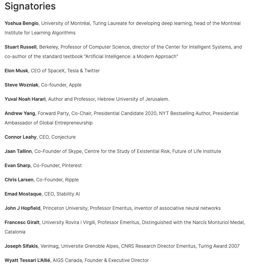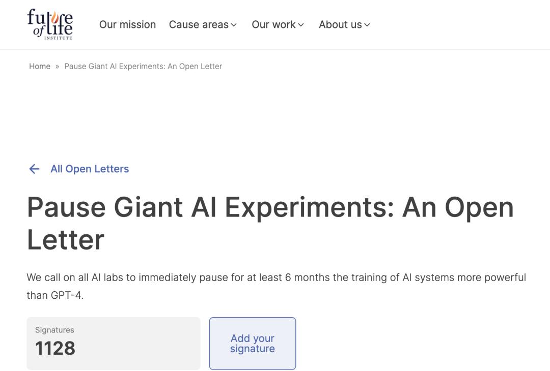 这封信由非营利性的 "生命的未来研究所 "(Future of Life Institute)发出(https://futureoflife.org/open-letter/pause-giant-ai-experiments/),截至目前,已经有 1128 人签名。
