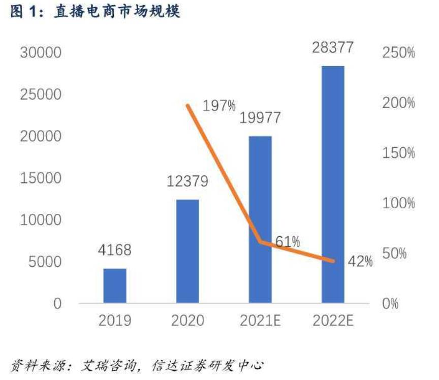 当下,直播电商市场呈现规模体量大与用户规模大两个明显特征。根据CNNIC披露的直播电商用户数据及艾瑞咨询披露的直播电商市场规模,信达证券对中国直播电商市场规模2021年和2022年的预测值进行测算,认为2021年中国直播电商市场规模将2万亿,并预计2022年全年中国直播电商市场规模达到2.84万亿,同比增速42%。