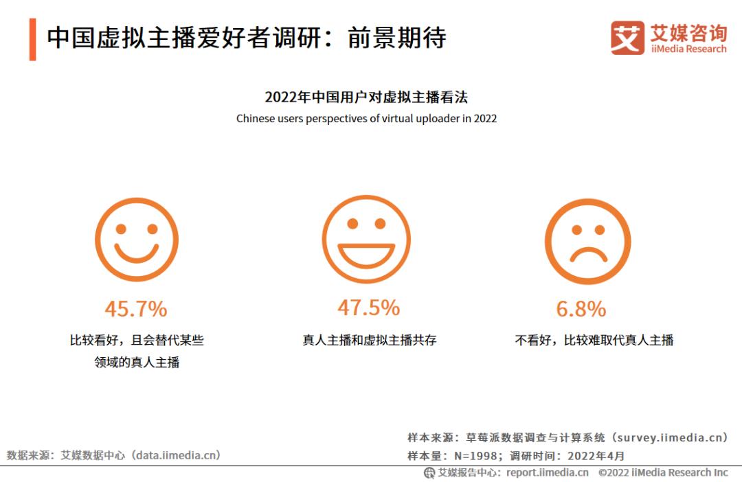 其中超过六成的网民更关注虚拟主播,这说明虚拟主播正在释放巨大的商业价值。同时47.5%的受访用户认为未来真人主播和虚拟主播将共存,45.7%的受访用户认为虚拟主播将会替代某些领域的真人主播。随着消费群体的需求多样化和虚拟现实技术迅速发展,未来虚拟主播的应用将更加广泛。
