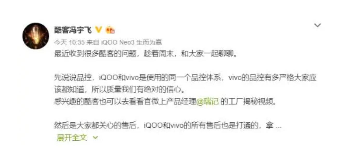 根据前iQOO负责人冯宇飞的说法,iQOO和vivo共用的是同一个品控体系。言外之意就是,iQOO的手机性价比很高,但不会以牺牲品质作为前提。另外,在售后服务方面,用户也能拿着自己的iQOO手机到任何一家vivo售后门店,享受同等级别的售后质量。