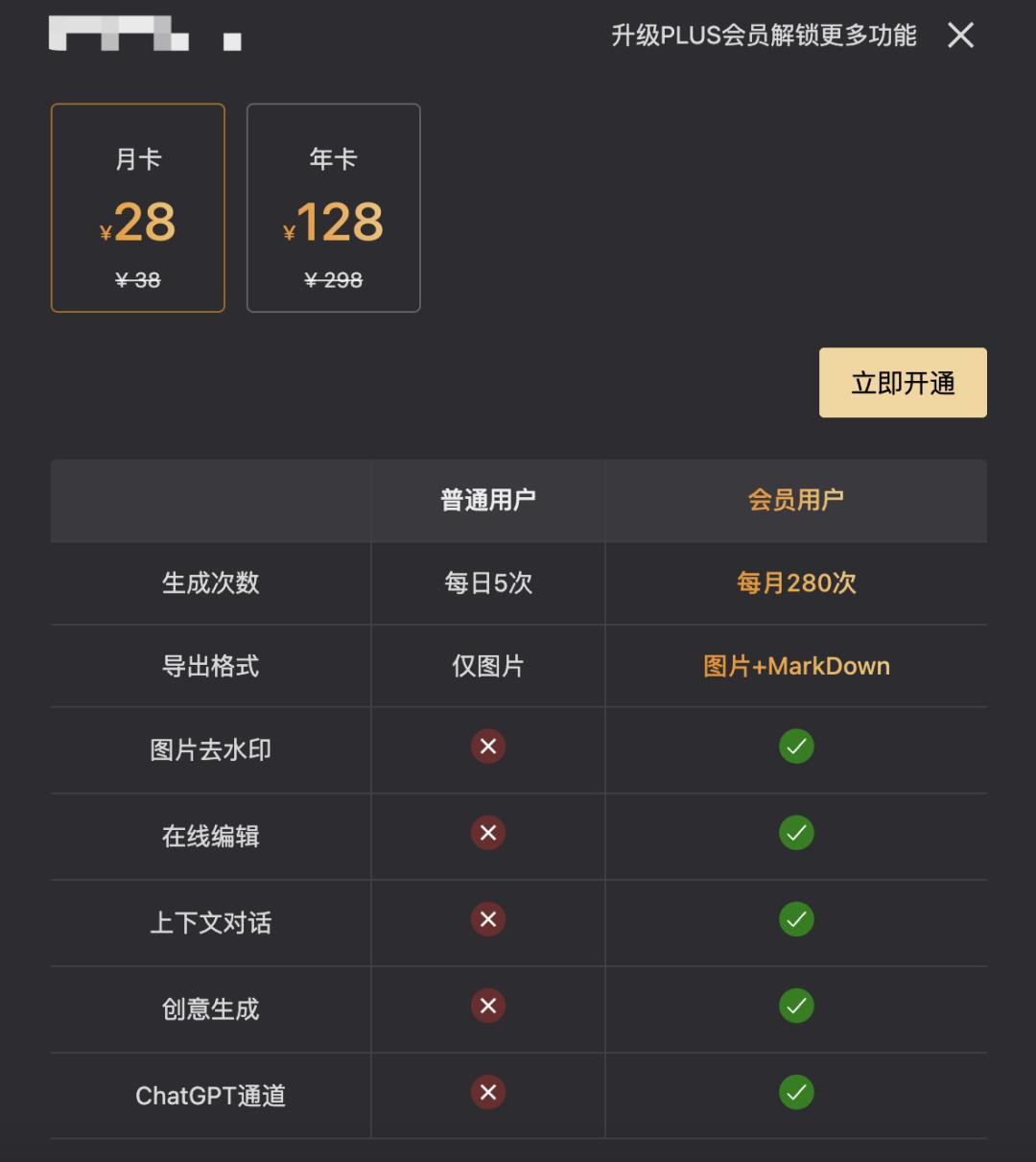 目前,ChatMind分为普通版本和Plus版本,按月卡和年卡收费。会员用户不限制使用次数和导出形式。不过从用户的反馈来看,在收费后用户转化率并不高。