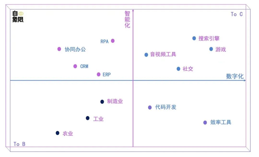 我们以数字化和智能化为两个坐标轴,拉出了一个当下应用的坐标系。(下图中所举例并不全面,只是每个象限中的典型案例。)