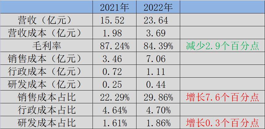 在巨子生物产品的成本结构中,销售成本是占比最大的一项,而材料成本却仅相当于销售成本的一半,研发成本则为销售成本的6%