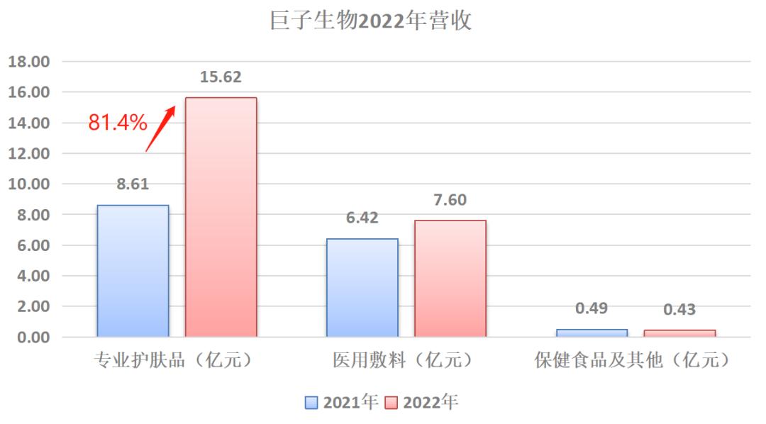 整个2022年,巨子生物的业绩增长正源于功能性护肤产品的极速放量,较2021年同比增长81.4%;而医用敷料业务的营收却仅同比增长18.3%。护肤品与医用敷料的最大差异在于它们一个属于化妆品,一个属于医疗器械;一个是红海市场,一个是蓝海市场。