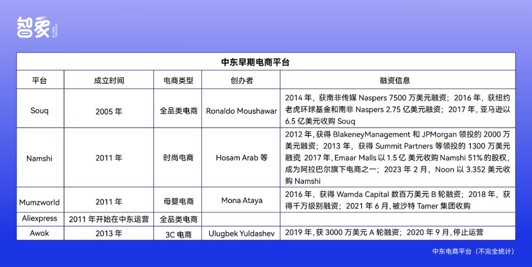 在执御之前,中东电商可以用贫瘠来形容。主要电商平台包括综合电商Souq、时尚电商Namshi、母婴电商Mumzworld、Aliexpress(速卖通)和3C电商Awok。