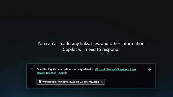 Security Copilot拥有一个极其简洁的界面,能够接受自然语言输入,用户只需向其发送提示——可以是问题和请求,也可以是提交的文件、URL、代码片段或威胁指标——Security Copilot会动用安全模型的全部功能来分析事件或执行任务。