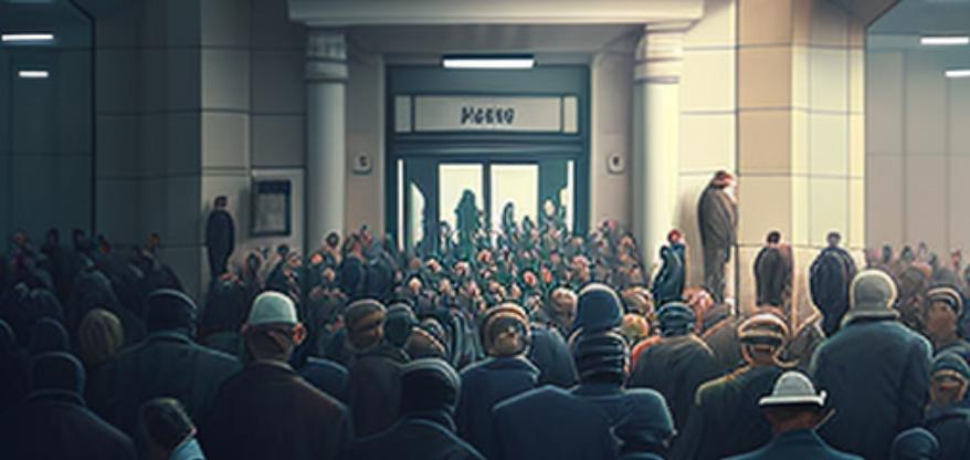 翻译成中文,我写的是「很多人失业了,他们站在门口,低头思考,没有一个人进门」。