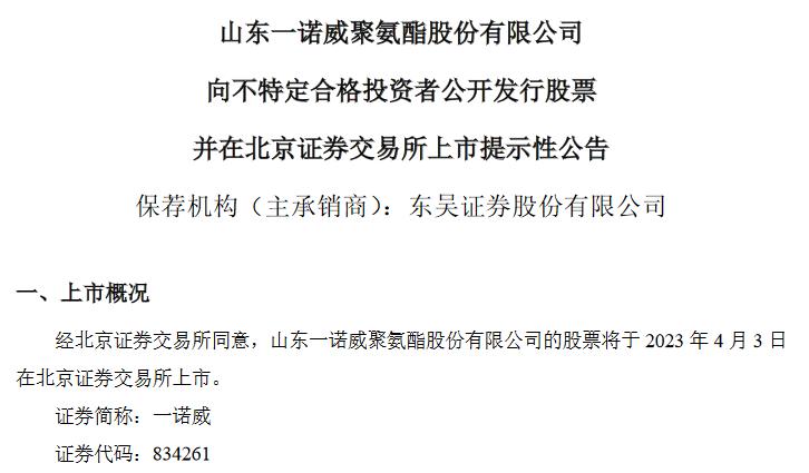 挖贝网 3月30日消息,一诺威(834261)将于4月3日在北交所上市,同日从新三板摘牌。据介绍,公司是聚氨酯原材料及 EO、PO 其他下游衍生物系列产品规模化生产企业,2022年营收达到63亿元,可在北交所上市企业中排至前五。